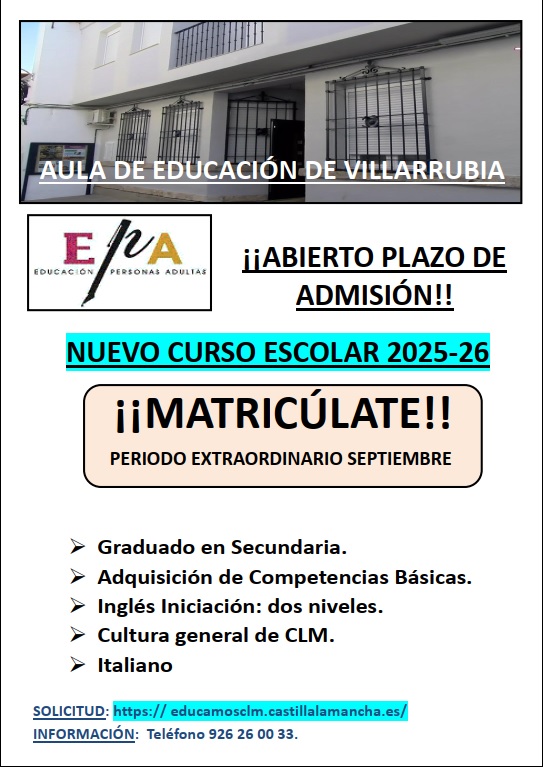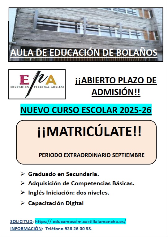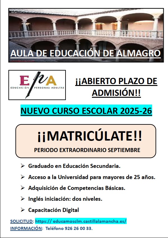 Puedes presentar tu solicitud en el CEPA de Daimiel o en las aulas de Almagro, Bolaños de Calatrava y Villarrubia de los Ojos. O también por Internet en Educamos CLM o a través de la sede electrónica de la Administración de la Junta de Comunidades de CLM.